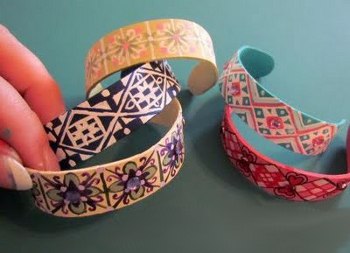 Очень просто сделать браслеты из деревянных палочек для мороженого или медицинских шпателей. Для этого надо предварительно в течение суток замочить их в воде, чтобы они стали гибкими. Медицинские шпатели можно купить в аптеке, и они будут лучшей основой если ты хочешь браслет потолще. Теперь надо достать их из воды и очень аккуратно поместить в стакан или чашку подходящего диаметра так, чтобы палочки приняли их форму. Оставьте их в таком положении сохнуть. Предже чем доставать палочки из чашек, убедитесь, что они полностью высохли. Вот такие заготовки для браслетов у вас должны получиться. Осталось раскрасить браслеты своими руками красками, украсить тканью, бумажной аппликацией в технике декупаж, бусинками, пуговицами или чем-то другим. Полезный совет: лучше сделать браслет чуть меньшего диаметра, чем вам требуется, т.к. при украшении браслета, в частности, при обработке его краской и клеем, он может немного распрямиться и стать больше. ![]() | |