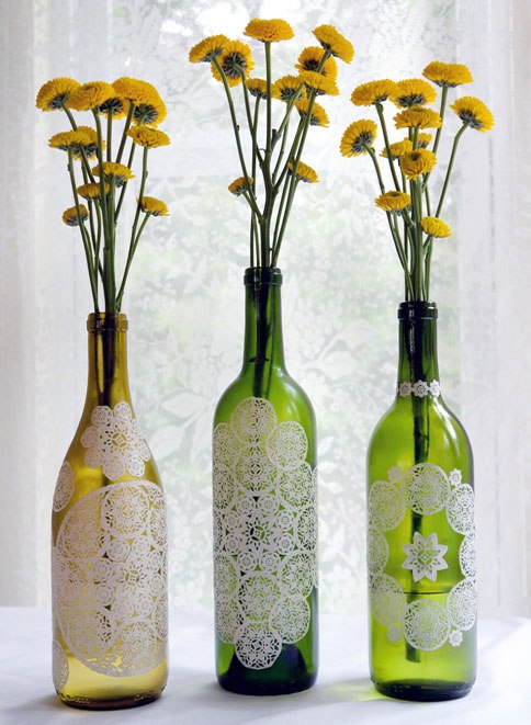Для работы нам потребуется: бутылка или ваза; ажурная салфетка; клей ПВА; акриловый лак. Из салфетки вырезаем нужный нам узор и кистью на заднюю поверхность салфетки наносим тонкий слой белого клея (к примеру, ПВА). Клей предварительно можно смешать с небольшим количеством воды. Много клея не нужно, иначе он впитается в салфетку, и при попытке поднять салфетку с поверхности стола она порвется. Затем аккуратно переносим салфетку на бутылку или вазу и даем ей высохнуть. Если края не приклеились, ничего страшного, главное рисунок аккуратно лежит на поверхности! Далее по высохшей поверхности наносим второй слой клея при помощи все той же кисти. Осторожно уберите остатки клея мягкой тканью. Gосле высыхания обработайте поверхность бутылки или вазы акриловым лаком. Дайте высохнуть. Акриловый лак не позволит воде размочить салфетку и испортить наш шедевр. Теперь Вы можете использовать созданную Вами вещь по назначению! | |