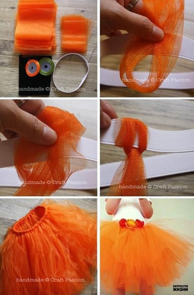 Сделай пышную юбку Тебе понадобятся: Широкая резинка, которая послужит основой для юбки. Ленты из органзы или другого материала, который позволит создать ощущение пышности. Для одной юбки понадобится много лент, не меньше 20ти. Возьми ленту и завяжи ее на резинке, как это показано на примере. На одном уровне можно привязать пару лент разной длинны. | |