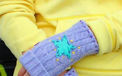 Первым делом тебе понадобится старый свитер, который родители бы уже хотели выкинуть. Обязательно спроси разрешения у родителей на использование свитера, иначе ты ненароком можешь испортить хорошую вещь:). Кроме свитера или кофты тебе понадобятся ножницы, нитки, иголка и ткань для аппликации. (Делать или не делать аппликацию решать тебе) Возьми ненужный свитер или кофту и отрежь рукава на расстоянии примерно 15-20 сантиметров. Теперь отогни край рукава(нижнюю часть) примерно на три сантиметра. Сделай небольшой надрез справа для левой руки, и слева для правой. Примерь перчатку, посмотри хорошо ли входит большой палец в получившееся отверстие. Собственно сама перчатка уже готова. Теперь ты можешь пришить к перчаткам какой-нибудь оригинальный узор из ткани, или вышить что-то крупными стежками, а можешь все оставить без изменений. | |