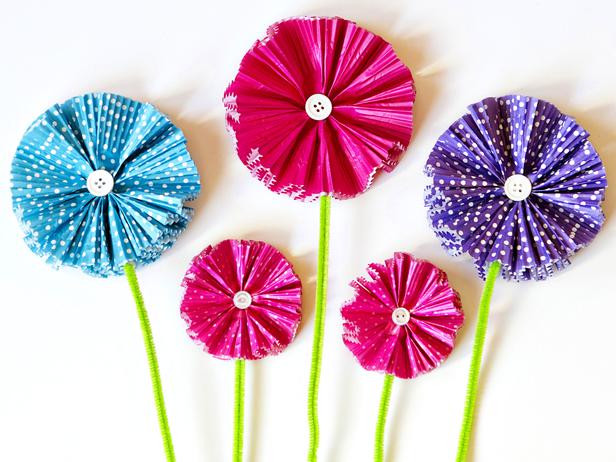 Цветы из формочек для кексов Тебе понадобятся: Красивые и яркие бумажные формочки для кексов (маффинов); Клей; Ножницы; Красивые пуговицы; Зеленый картон или белый картон и зеленая краска, возможно кусочек зеленой ткани. Возьми примерно четыре бумажные формочки. Согни каждую из них пополам. Затем сделай различные загибы. Нужно чтобы у тебя получились разные "лепестки", как на примере. Покрой центры лепестков клеем. Склей лепестки в один цветок. Приклей в центр цветка красивую пуговичку. К обратной стороне цветка приклей стебелек. Стебель для цветка можно сделать из картона или бмаги, если согнуть ее в тоненькую трубочку и склеить. Стебель можно покрасить зеленой краской или обклеить зеленой бумагой, или обклеить зеленой тканью. Красивые цветы готовы. Теперь ты можешь поставить их в вазу или приклеить на бумагу. Чтобы твой цветок стал объемным, ты можешь приклеить точно такой же цветок на заднюю часть готового цветка со стеблем. | |
