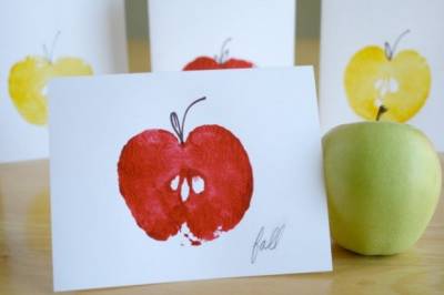 Все что тебе понадобится для создания открытки это яблоко (есть его после использования будет нельзя!), деревянная палочка или шпажка, краски. Попроси старших разрезать тебе яблоко пополам. Возьми лист бумаги, сложи его пополам. Возьми желтую, красную, зеленую или оранжевую краску. В верхнюю часть половинки нужно воткнуть палочку, чтобы яблоко было удобнее макать в краску. Окуни половинку в краску и оставь штамп в центральной части листа. К штампу ты можешь пририсовать фломастерами черешок и листики. | |