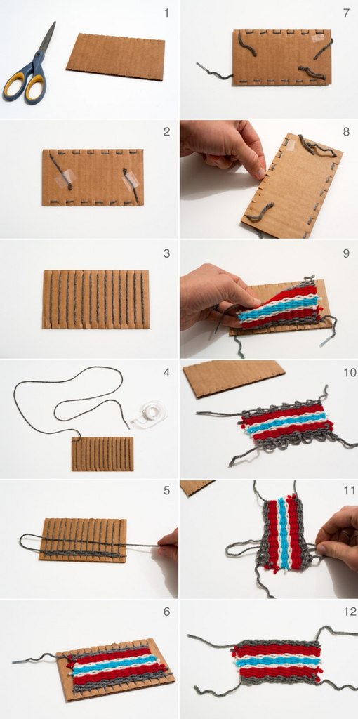 Как связать красивый коврик для куклы без спиц? На самом деле сделать это довольно просто, его нужно сплести. Тебе понадобятся нитки для вязания того цвета, какого ты хочешь чтобы был твой коврик. Картон размером примерно 7 на 12 сантиметров, но подойдет и другой. Также тебе понадобятся ножницы. А вязать мы будем вот такие красивые коврики: Кстати, точно также можно вязать платья для кукол. Только нужно будет подобрать размер картона и сшить две половинки платья вместе. Наглядная инструкция по вязанию без спиц: (комментарии и пояснения под картинкой) Самое главное это правильно сделать заготовку для вязания. Для этого нужно взять картон и на равном удалении друг от друга (можно сделать разметку с помощью линейки) сделать 12 - 13 надрезов (по 0,5 см). Надрезы должны быть сделаны с каждой из самых длинных сторон друг на против друга. Теперь нужно взять длинную нить для вязания и один ее конец приклеить к картонке кусочком скотча. Это будет обратная сторона (не рабочая) (пример №2). Нитку нужно продеть в крайний первый паз и провести через противоположный пас на рабочей стороне, перевернуть картонку, сделать стежок (уже горизонтальный) через соседний паз, снова перевернуть картон и провести нитку на противоположную сторону. И так до конца картона, затем нужно оставить конец нити небольшой длинны и также приклеить его скотчем к обратной стороне. Обратная сторона твоего картона должна выглядеть как на примере №2, а рабочая как на примере №3. Теперь начинаем плести коврик. Возьми нить для вязания (довольно большой длинны), завязи небольшой узелок на верхнем краю первой ниточки нашей заготовки и проводи нить через натянутые полоски. Только обязательно нужно то заводить нить под нить основания, то проводить под ней - чередуй. Когда нитка закончится ее нужно будет привязать узелком к основанию. Если захочешь добавить нитку другого цвета, точно также сначала привяжи ее к основе, а затем продолжай плести. Когда коврик будет готов, убери скотч с обратной стороны, аккуратно вынь ниточки из пазов и сними коврик с картонки. Затяни, растянувшиеся ниточки и не забудь закрепить концы. Все ты сплела настоящий узорчатый коврик, часть платья или юбки для куклы. Если взять картон меньшего размера (более узкий), то можно сплести кукле шарф. Так что теперь ты можешь сплести много полезных предметов для своих кукол. | |