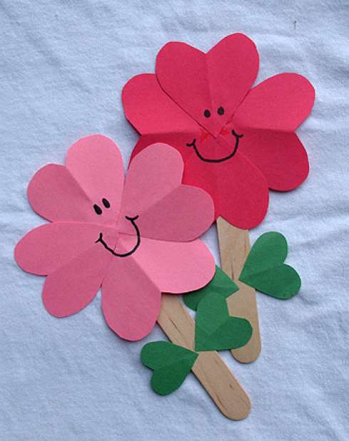 Суть идеи проста: сделать цветок с лепестками в форме сердечек с стеблем из палочки от мороженного. Тебе понадобятся: Палочки от мороженного Цветная бумага разных цветов (обязательно зеленая) Фломастер Клей. Первым делом, нужно вырезать 4ре сердечка одинаковой формы розового или любого другого цвета (смотря какого цвета ты хочешь сделать свой цветок). Затем еще два сердечка зеленого цвета, они будут играть роль лепестков и их нужно сделать размером поменьше. Самый просто способ вырезать аккуратное сердечко из бумаги, это взять листок, сложить его пополам и вырезать половинку сердечка. Когда ты раскроешь вырезанную часть бумаги у тебя получится полноценное аккуратное сердечко. Возьми палочку от мороженного и к верхней части палочки аккуратно приклей 4ре лепестка сердечка. Затем примерно в середине по бокам приклей зеленые сердечки листики. После того как клей высохнет, возьми фломастер и нарисуй на цветочке улыбающуюся рожицу. Теперь твой цветок подарок готов. | |